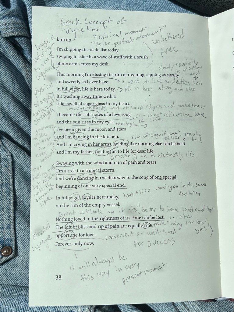Because I have so many favorites from this collection, I was struggling to pick just one to dive deeper into to analyze. However, the beauty of the imagery and philosophy in “kairas” particularly stuck out for me as one that would be the most fun to close read! Here’s a picture to read the poem along with my annotations: